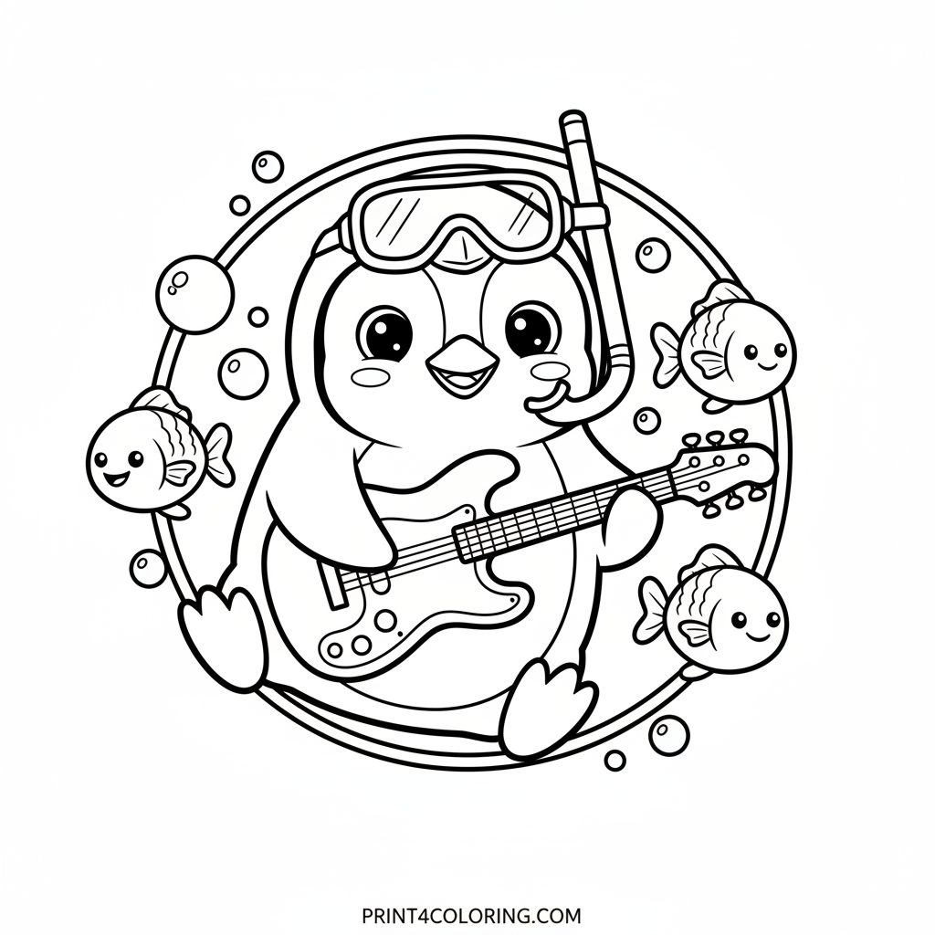 Dive into a super cute underwater concert with a happy little penguin! Wearing a tiny snorkel mask, this musical bird is 'strumming' a bubbly electric guitar, surrounded by friendly fish and shimmering sea bubbles. Get ready to add vibrant colors to this cozy ocean scene and make some joyful noise with your crayons!