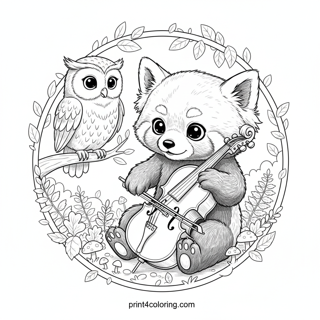 Join a fluffy red panda cub for its very first cello lesson in a magical, sun-dappled forest clearing. Watch as a wise owl offers gentle guidance amidst detailed leaves, ferns, and tiny mushrooms. A heartwarming scene perfect for coloring, inviting you to add vibrant hues to this cozy musical moment.
