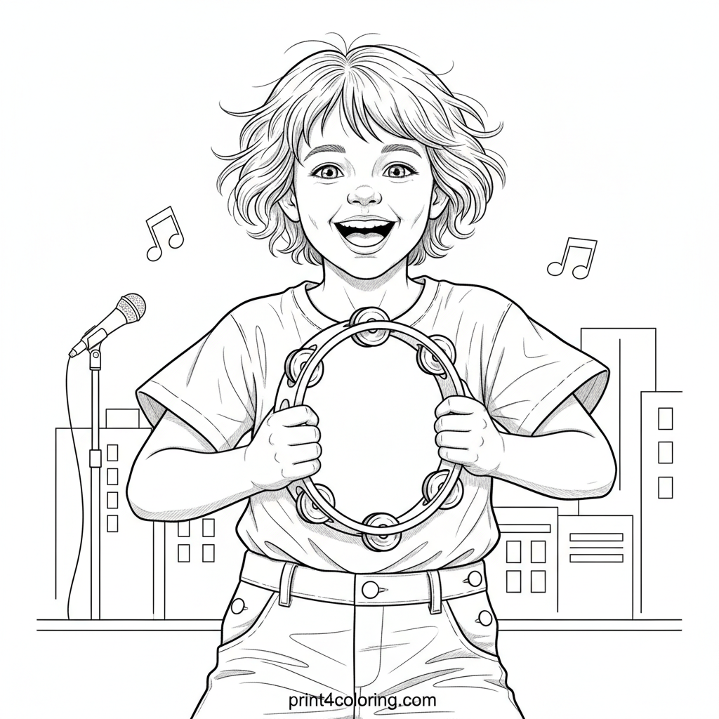 Feel the rhythm! This lively coloring page features a joyful musician caught mid-dance, vigorously shaking a detailed tambourine with a wide, happy grin. Their energetic pose and flowing clothes suggest vibrant movement. Imagine them on a stage or bustling street. Bring this musical celebration to life with your favorite colors!