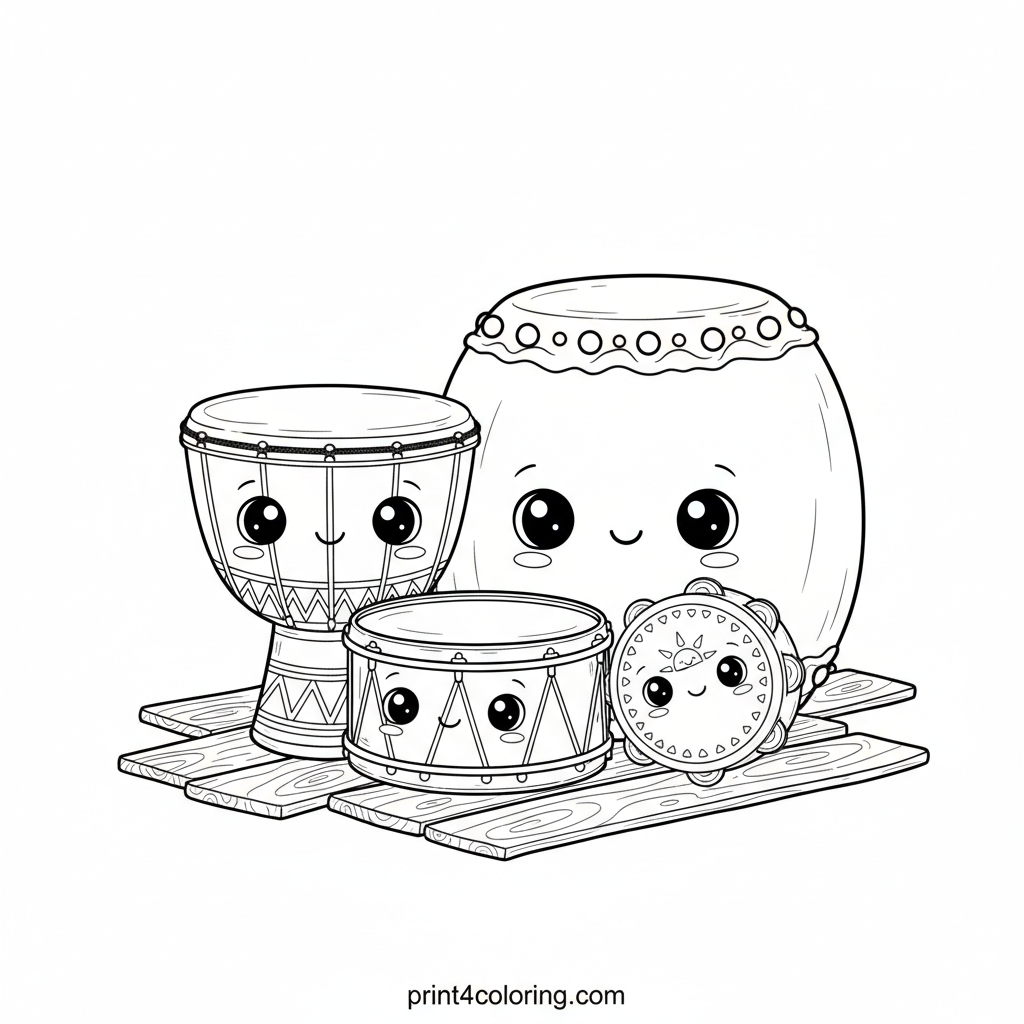 Embark on a global musical journey with this charming still life featuring drums from around the world! Discover a textured djembe, a majestic taiko, a classic snare, and a lively tambourine, all intricately detailed. Bring their unique sounds and cultures to life with your colors!