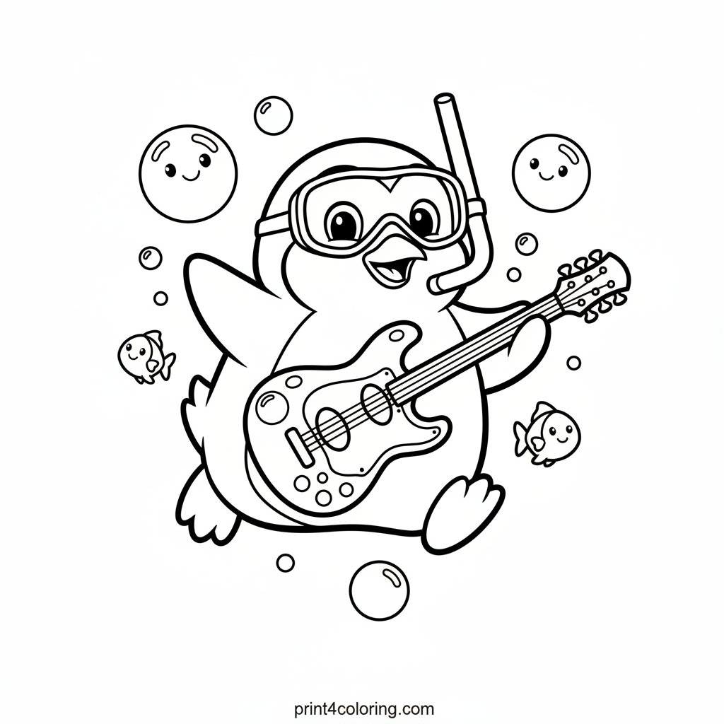 Dive into a bubbly ocean adventure with our super cool penguin! This little musician is rocking out with a pretend electric guitar, wearing a tiny snorkel mask, surrounded by cheerful fish and sparkling sea bubbles. Grab your crayons and bring this underwater concert to life!