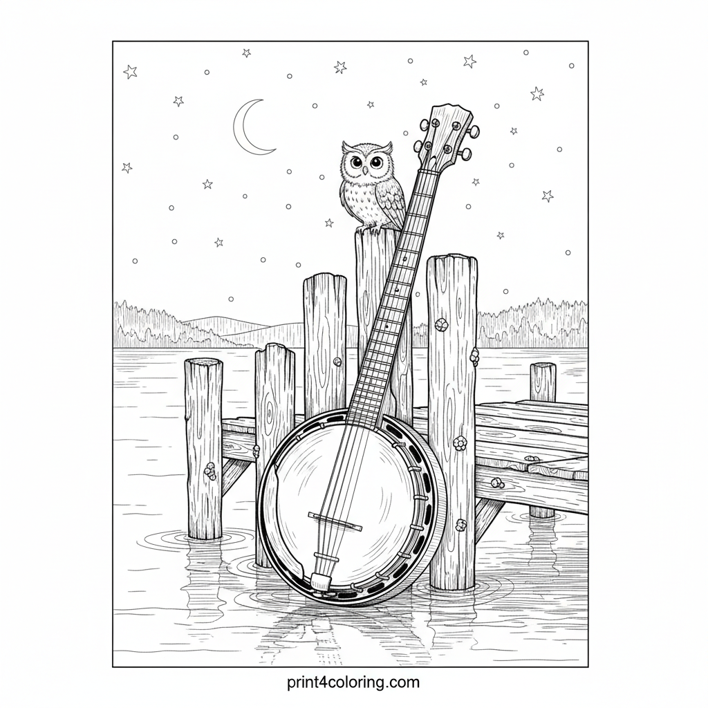 Discover a peaceful night scene where a detailed banjo leans against a rustic wooden pier. A curious little owl, with wide, observant eyes, perches on the banjo's neck, looking up at the twinkling stars. The calm lake water gently reflects the moonlight, inviting you to add vibrant colors to this enchanting lakeside serenade.