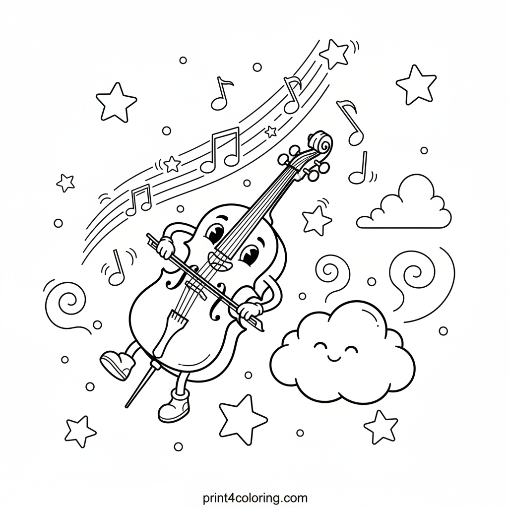 Float into a magical night sky with a smiling cello playing a gentle tune! A friendly cloud character listens intently as tiny musical notes twinkle like stars all around. This whimsical scene invites you to add vibrant colors to the celestial concert and bring the music to life.