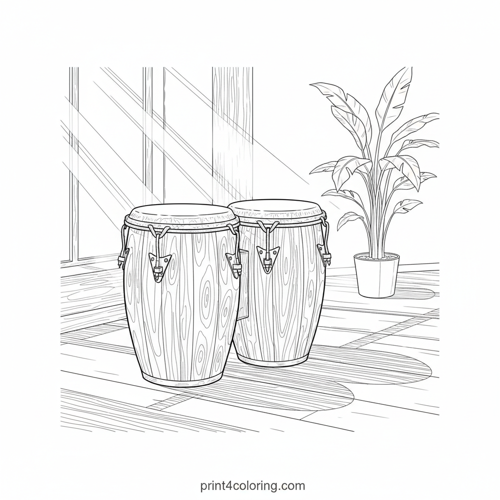 Step into a sun-drenched artist's studio where beautiful vintage bongo drums await your artistic touch. Sunlight dances through a window, illuminating rich wood grains, textured drumheads, and a leafy houseplant. Bring this detailed musical scene to life with your favorite colors and imagine the melodies!