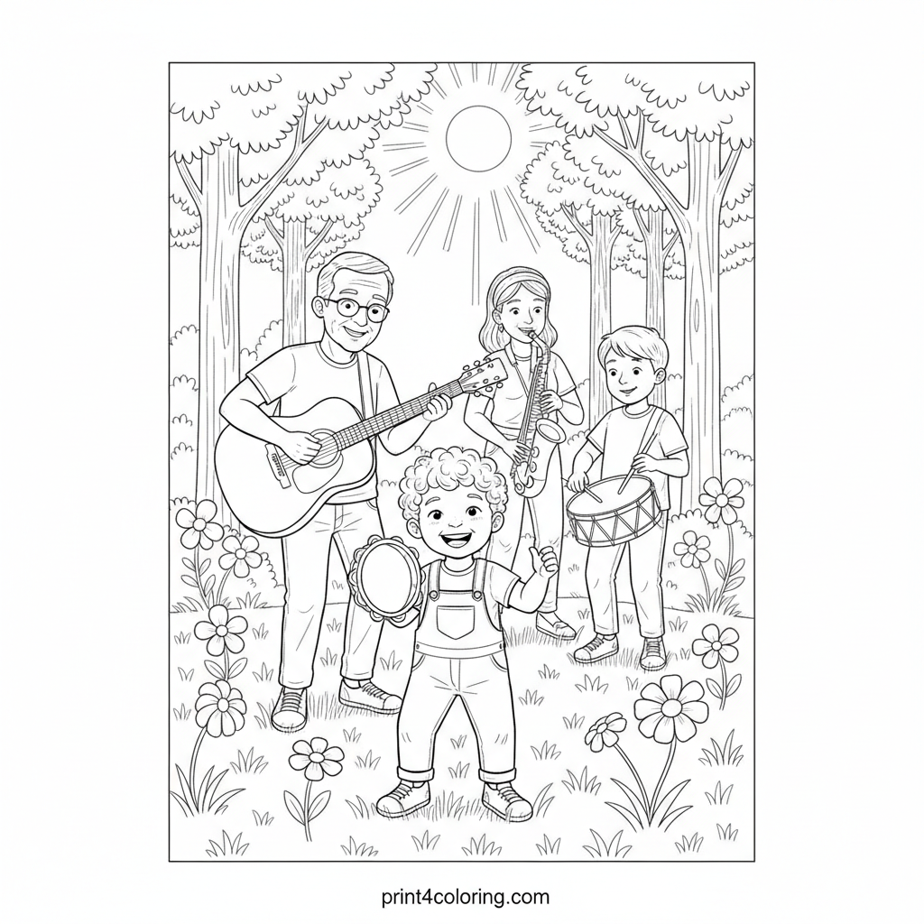 Step into a vibrant park where a diverse band creates joyful music! Children and adults enthusiastically play various instruments, including a happy child shaking a tambourine. This detailed scene invites you to color realistic instruments, blooming flowers, and the cheerful expressions of the harmonious ensemble under the warm sun.