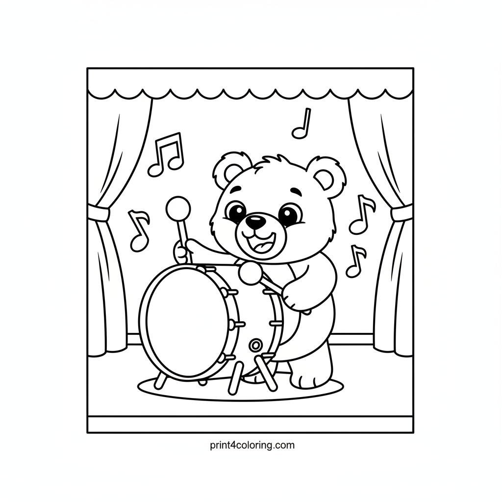 Meet a super happy and fluffy teddy bear, ready to make some music! With big, friendly eyes, he joyfully taps a large bass drum using a soft mallet. Watch as playful musical notes float around, bringing the scene to life. Grab your crayons and add vibrant colors to this delightful drumming adventure!