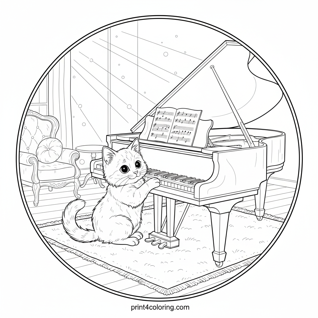 #kitten#cat#piano#music#cozy#room#pets#grand piano#detailed#coloring-page#printable