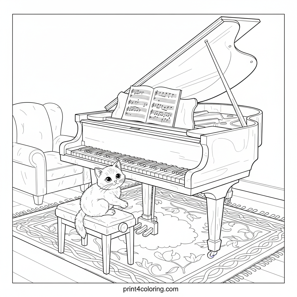The Curious Kitten's Grand Piano Adventure Coloring Page