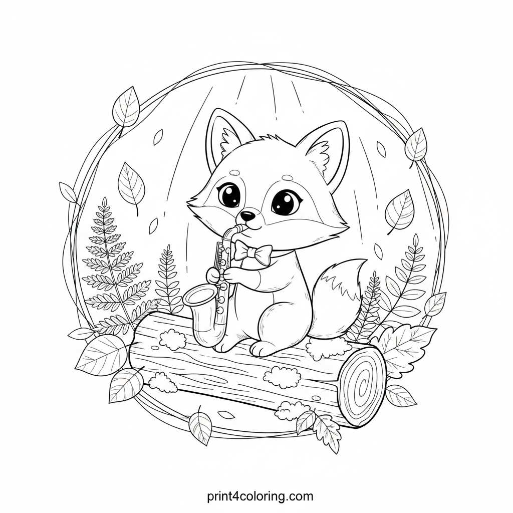 Step into a peaceful forest clearing where a wise fox, adorned with a tiny bow tie, practices his saxophone on a mossy log. Sunbeams filter through the autumn canopy, illuminating intricate leaves and ferns. This cozy scene invites you to add vibrant colors to a moment of musical tranquility in nature.