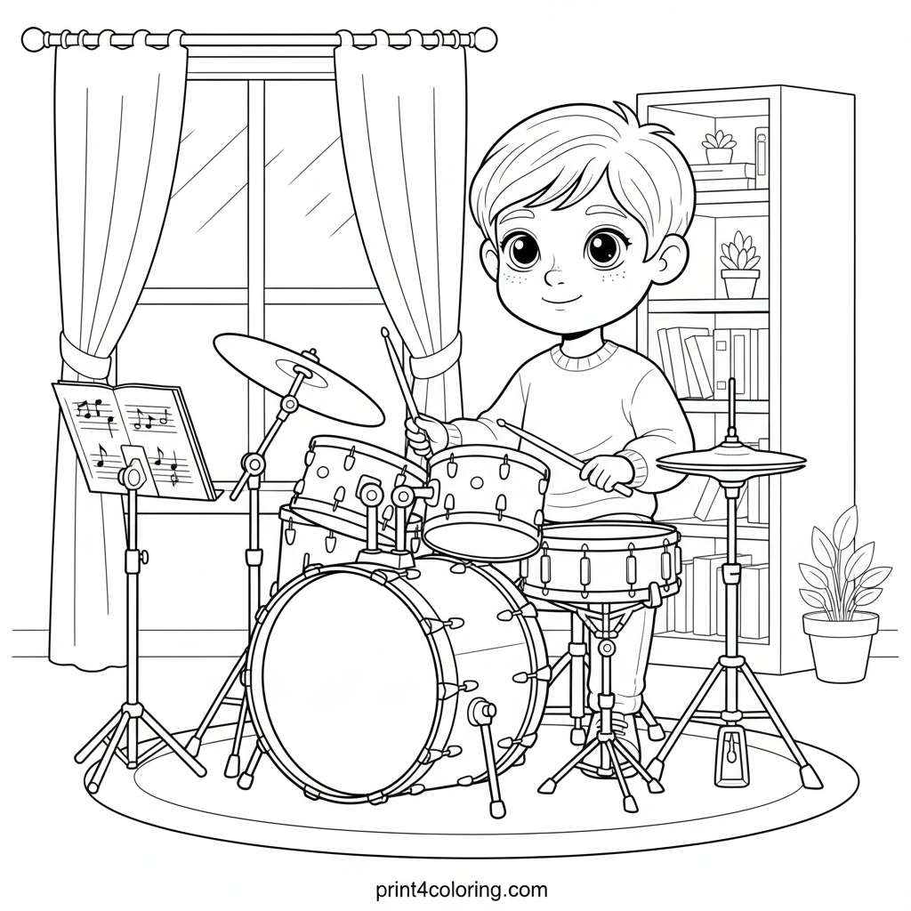 A wholesome child, around 8-10, sits at a detailed drum kit, drumsticks poised. Sheet music rests on a stand, ready for a rhythmic adventure. Subtle room details like a window and bookshelf add to the cozy atmosphere of this aspiring musician's practice space, perfect for detailed coloring.