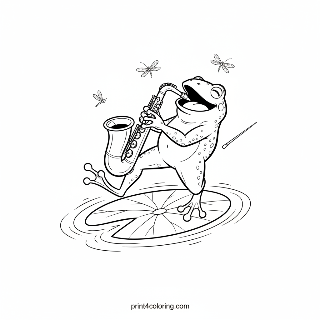 #frog#jazz#saxophone#lily-pad#dragonfly#music#swamp#amphibian#coloring-page#printable