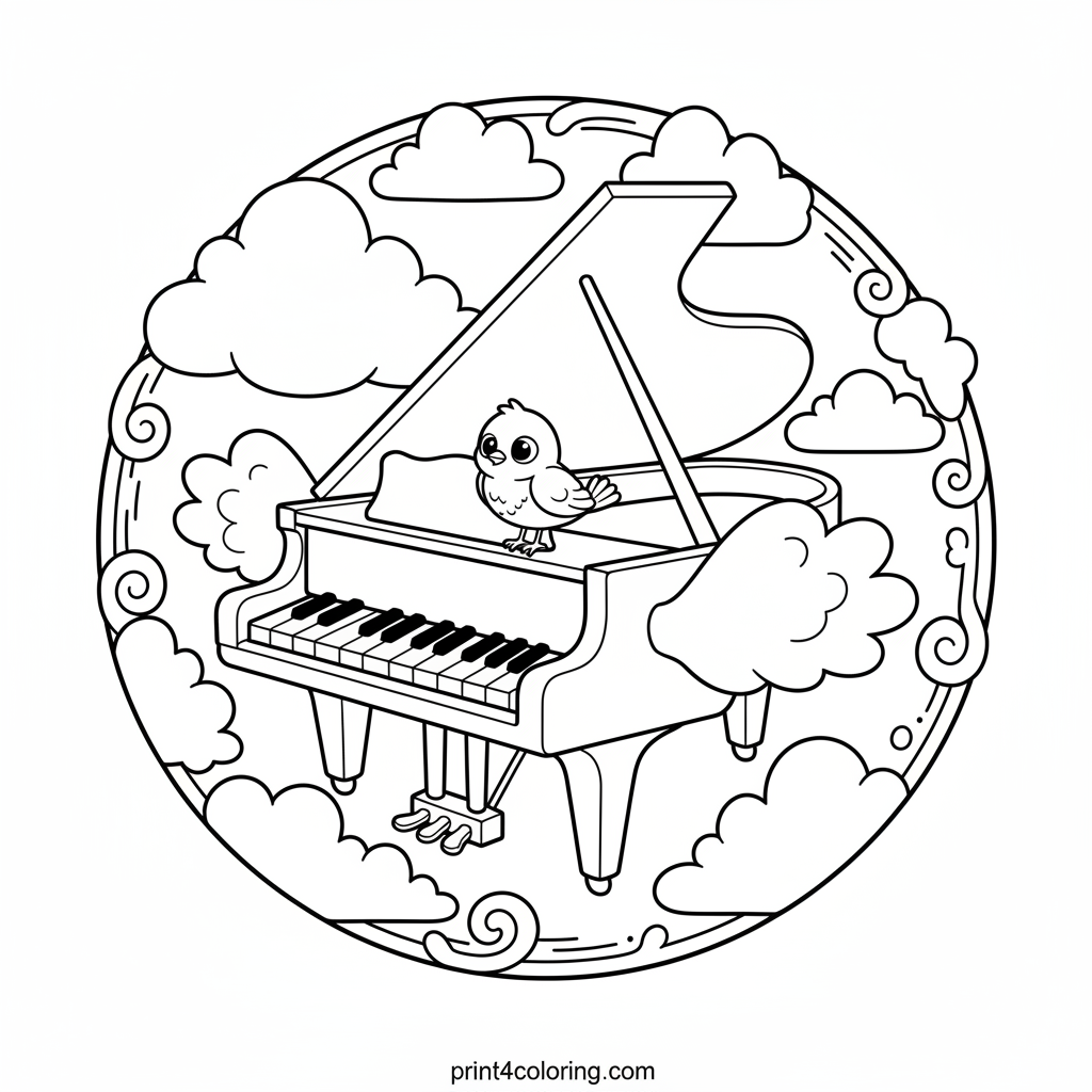 Imagine a magical grand piano with soft, fluffy cloud wings, gently floating through a sky full of friendly, puffy clouds. A tiny, curious bird has found the perfect perch on one of its keys, ready to hear a sweet melody. This cozy scene invites you to add a rainbow of colors to its dreamy journey.