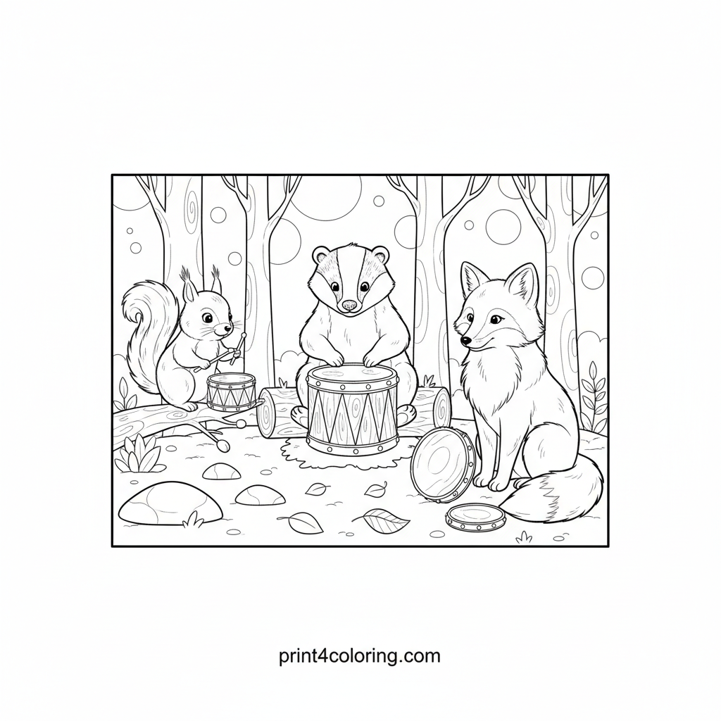 Woodland Rhythms: Forest Friends Drum Circle Coloring Page