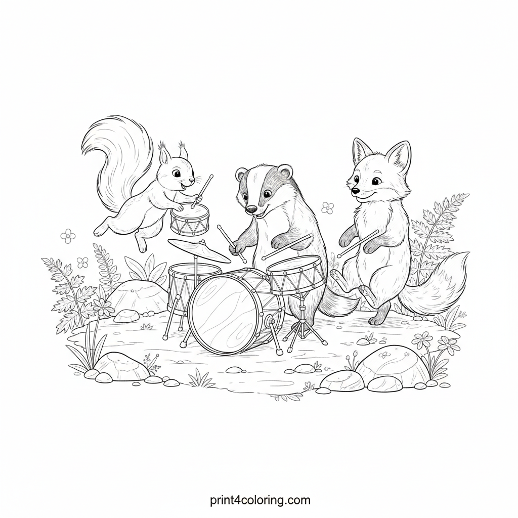 Join a curious squirrel, friendly badger, and watchful fox as they create joyful music in a sun-dappled forest clearing! This detailed scene features beautifully crafted miniature drums with intricate wood grain and textures. Bring their woodland symphony to life with vibrant colors and intricate shading. A delightful adventure awaits!