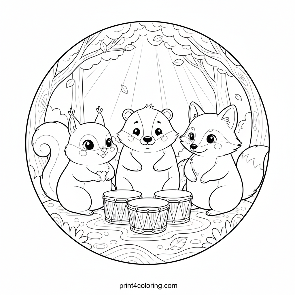 Woodland Rhythms: Forest Friends Drum Circle Coloring Page