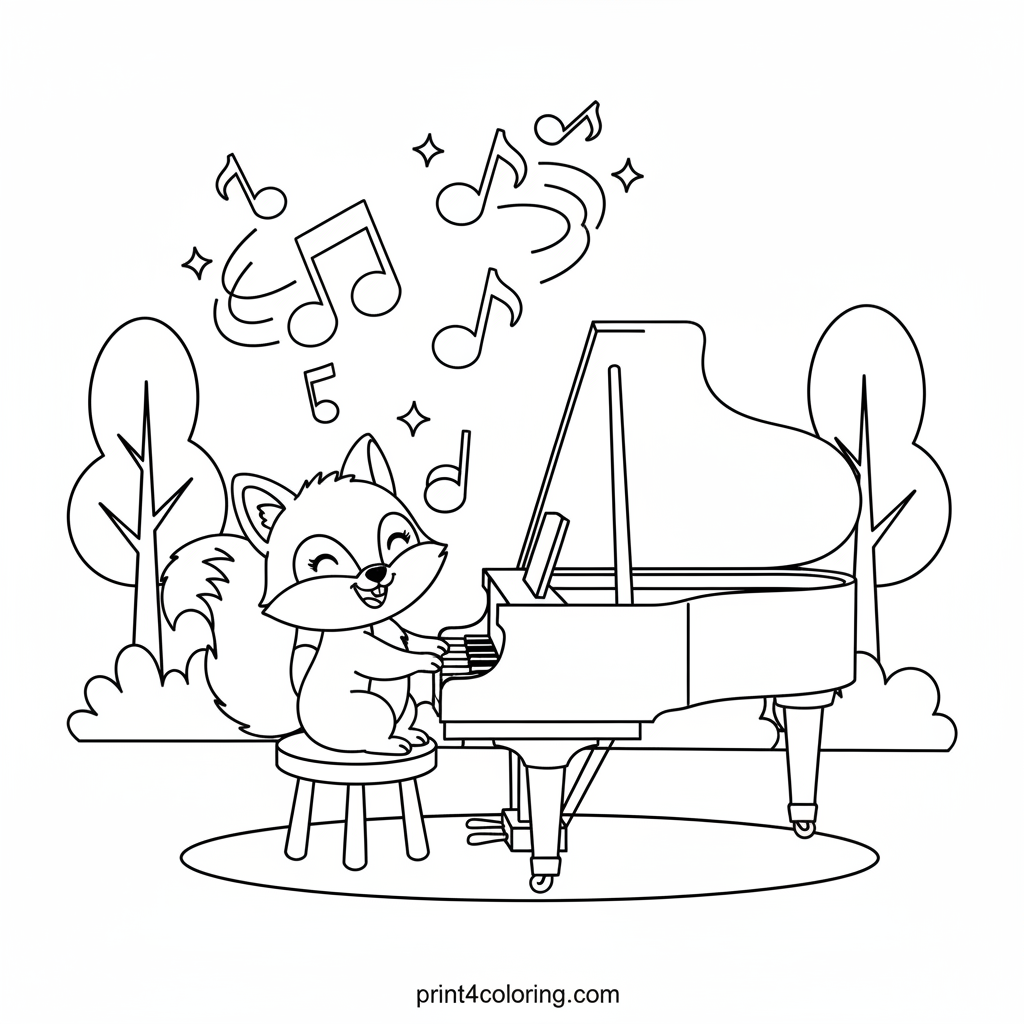 Imagine the sweet sounds as a happy little fox and a giggling squirrel play a grand piano deep in the forest! Joyful music notes twirl above their heads, filling the woodland with harmony. This delightful scene invites young artists to add vibrant colors, bringing their musical adventure to life.