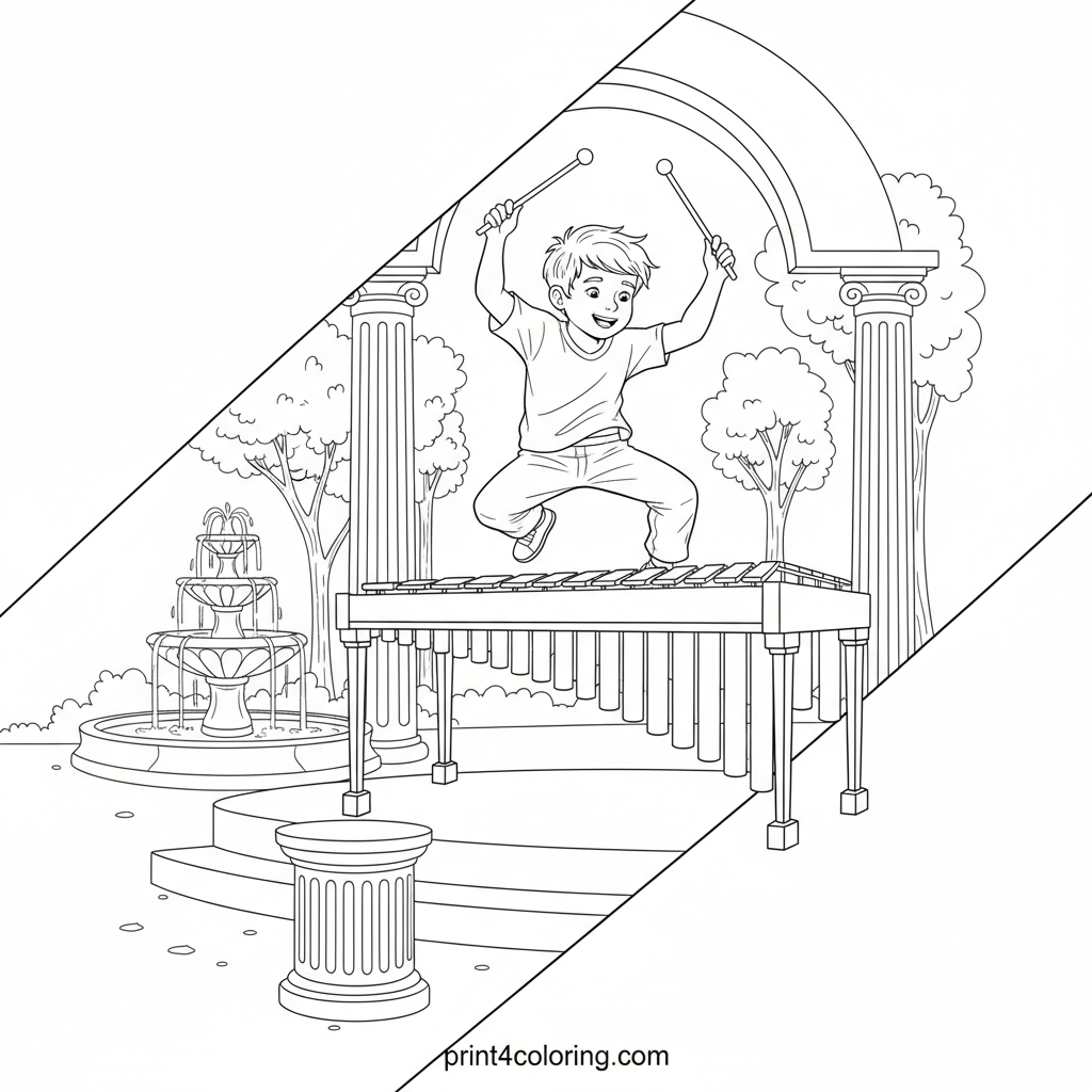 Imagine the beautiful music filling the air! A talented young musician is captured mid-performance, mallets dancing over a beautiful concert xylophone. This elegant outdoor stage, surrounded by lush trees and a sparkling classical fountain, is ready for your artistic touch. Bring this detailed masterpiece to life!