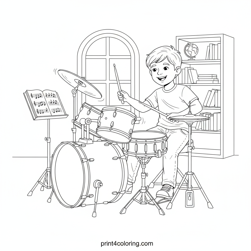 Step into a vibrant music room where a focused young drummer, around 8-10, is ready to create some beats! This detailed scene features a classic drum kit, sheet music, and subtle room details like a window or bookshelf. Perfect for aspiring musicians and artists to bring to life with color!