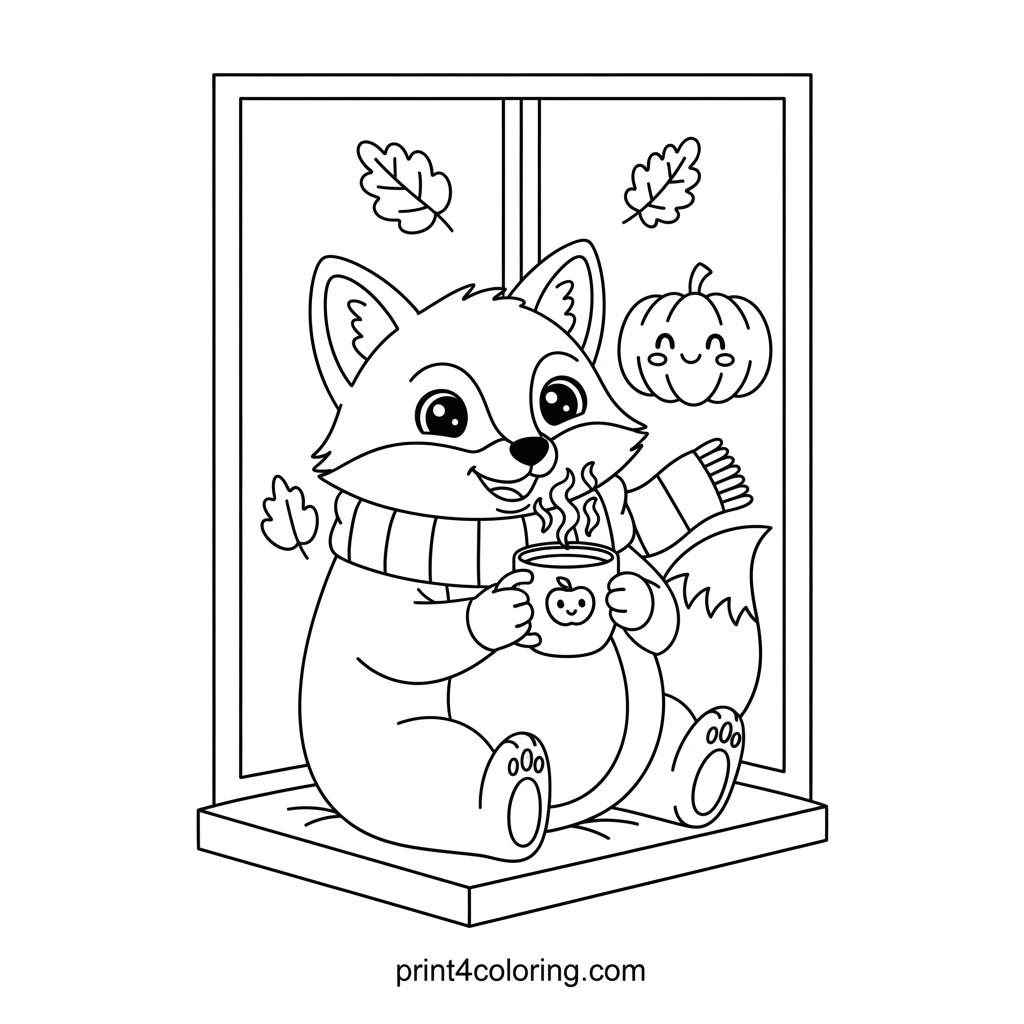 Snuggle up with this adorable coloring page! A cheerful fox, sporting a cute scarf, is enjoying a warm mug of apple cider by a cozy window. Outside, vibrant autumn leaves dance and a friendly pumpkin smiles, making for a perfect fall scene. Grab your crayons and bring this cozy moment to life!