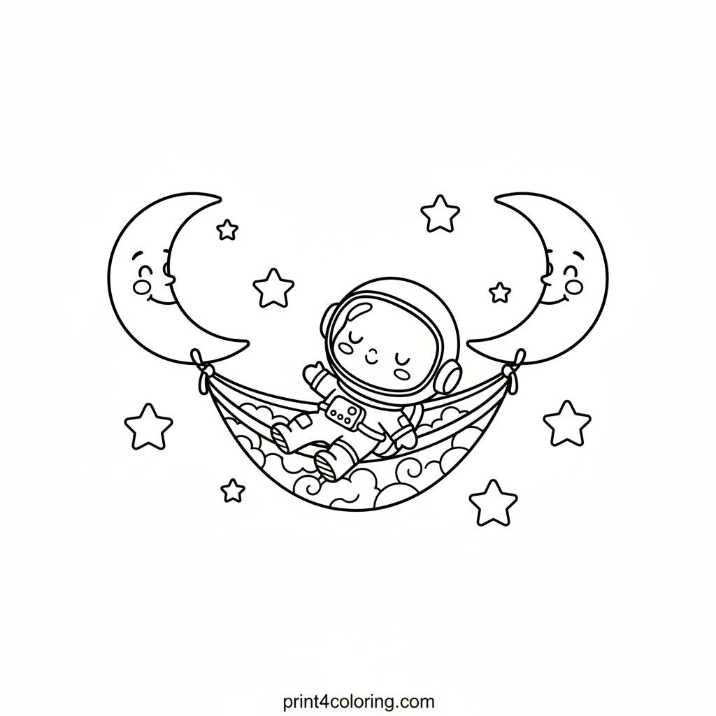 Imagine floating among the stars! Our friendly little astronaut is enjoying a peaceful nap in a cozy hammock made of sparkling stardust. Suspended between two smiling crescent moons, with countless twinkling stars all around, this scene invites you to add your brightest colors to a dreamy space adventure. What a wonderful way to relax in the cosmos!