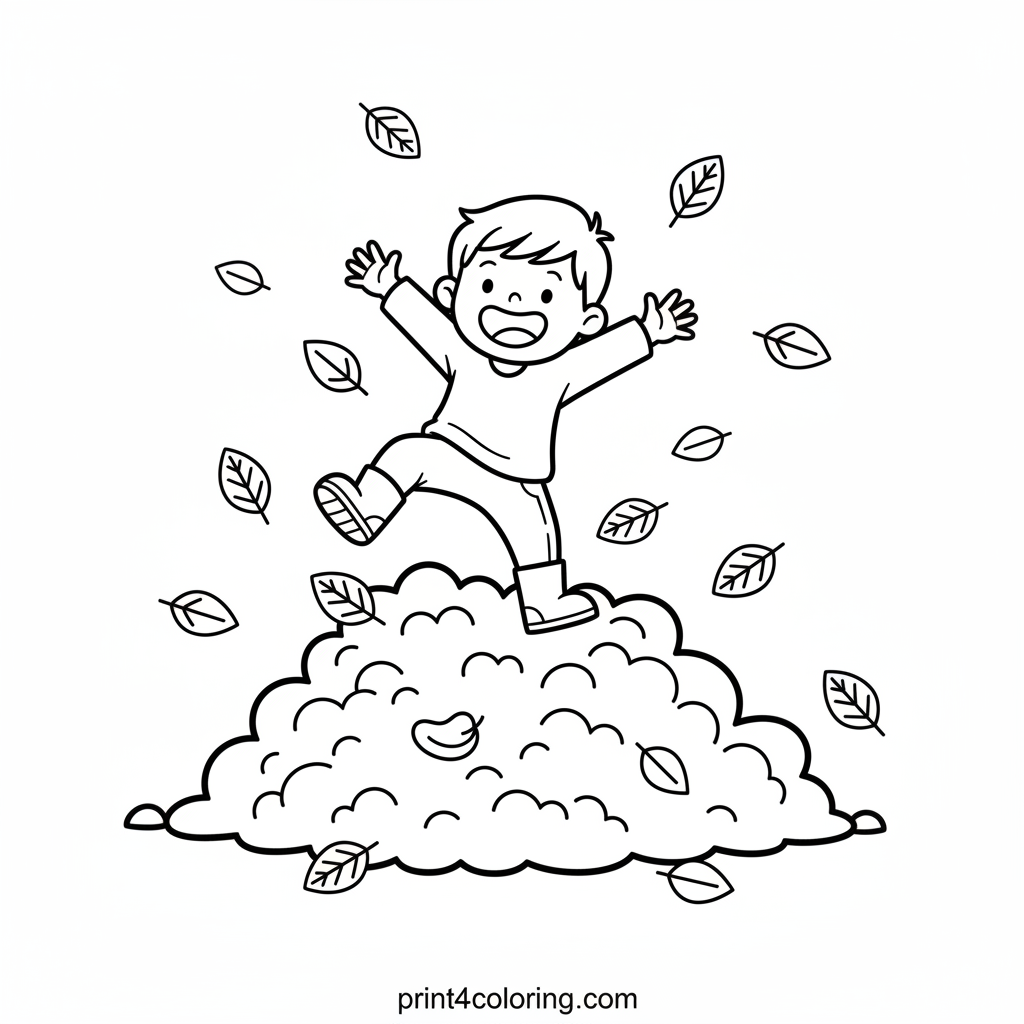 Capture the pure joy of autumn! This delightful coloring page shows a happy child, mid-air, with a huge smile, leaping into a giant, soft pile of colorful fall leaves. Watch as leaves playfully scatter around them. A perfect way to celebrate the magic of the season!