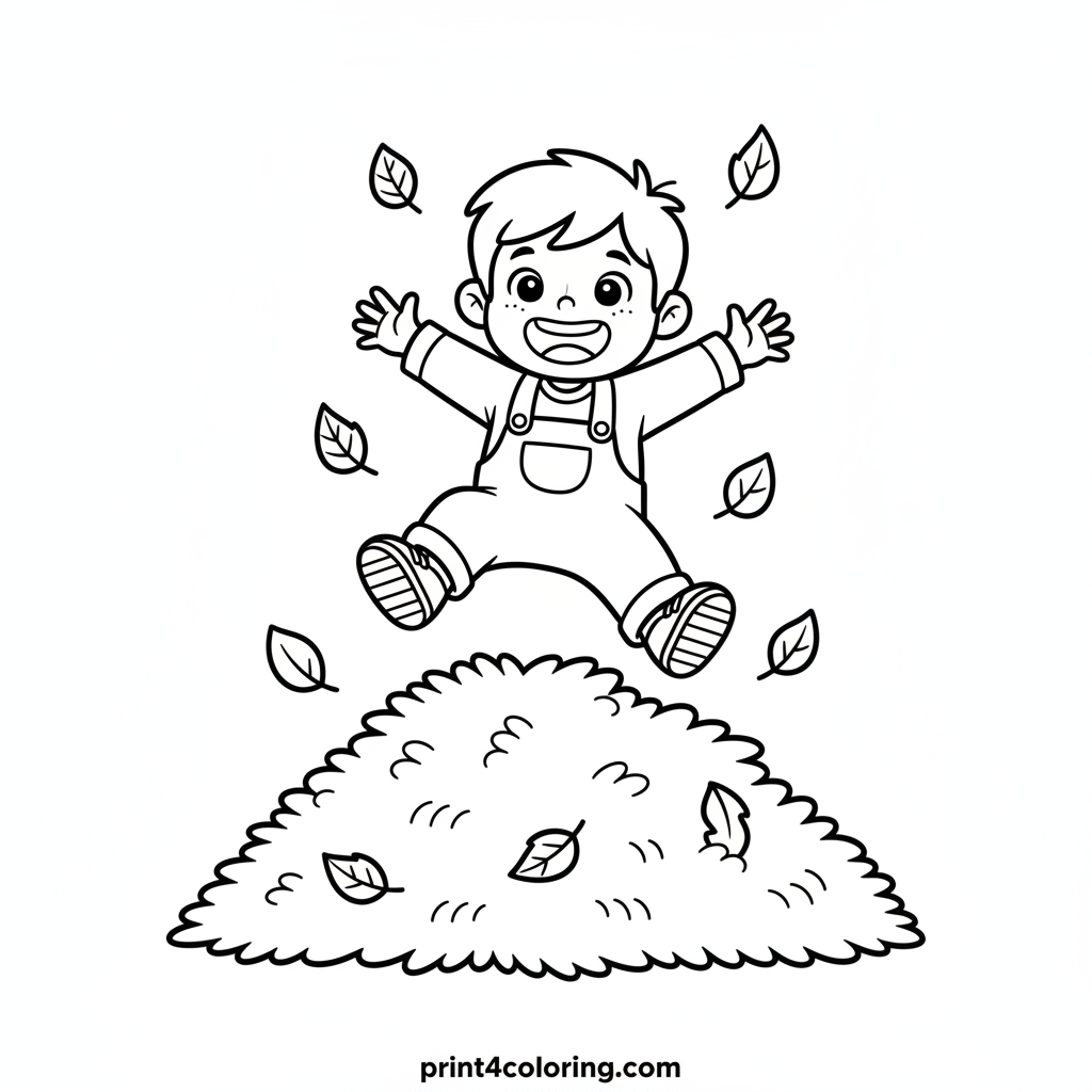 Imagine the crisp autumn air and the rustle of leaves! This page captures a moment of pure delight as a happy child, with a big smile, leaps high into a magnificent mountain of colorful fall leaves. Watch them soar through the air as leaves scatter in every direction, inviting you to add vibrant hues to this joyful scene.