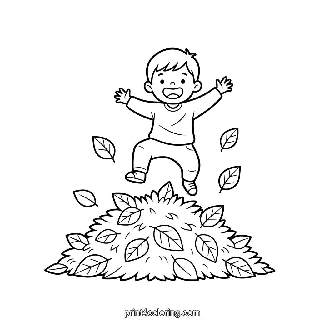 Experience the pure joy of autumn! A happy child, mid-air, leaps with a wide smile into a giant, fluffy pile of colorful leaves. Leaves scatter playfully around, creating a whirlwind of fall magic. Grab your crayons and bring this delightful, energetic scene to life!