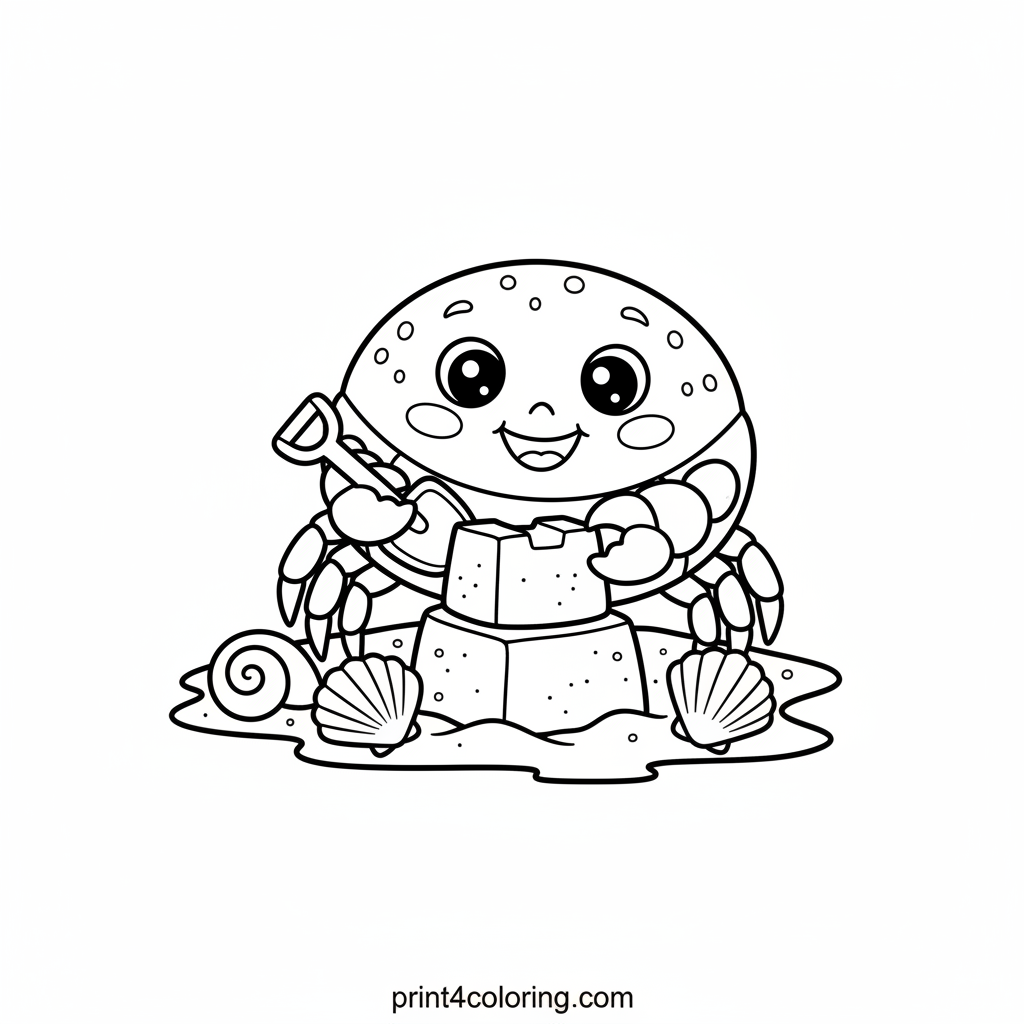 An adorable baby crab with big, friendly eyes is building its very first sandcastle on a sunny beach! This charming scene features a simple castle, a tiny shovel, and smooth seashells. Perfect for little artists, bring this delightful seaside adventure to life with your favorite colors.