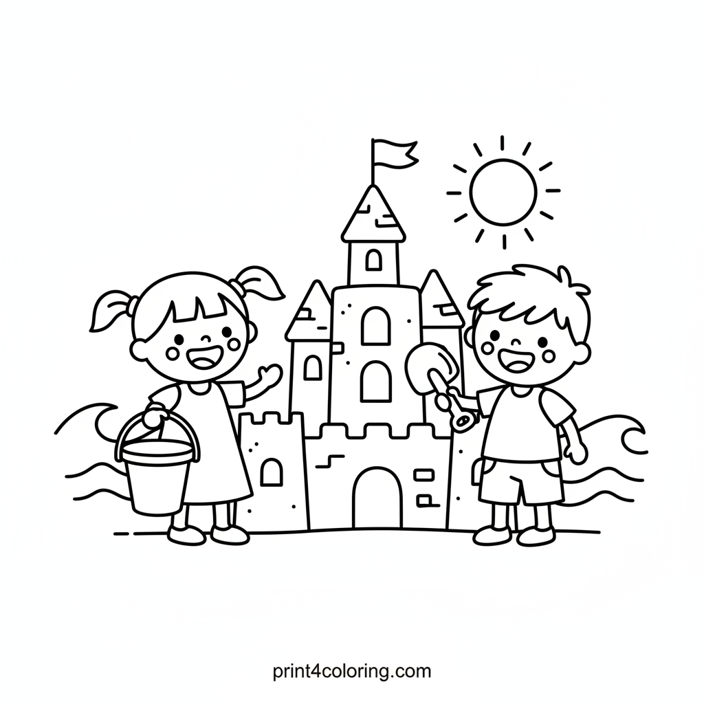 Dive into a sunny beach adventure! Two joyful children are busy creating the most amazing sandcastle you've ever seen. One holds a trusty bucket, while the other scoops sand with a shovel. Imagine the towering turrets and grand walls they're building, with gentle waves sparkling in the background. A perfect summer day for creativity!