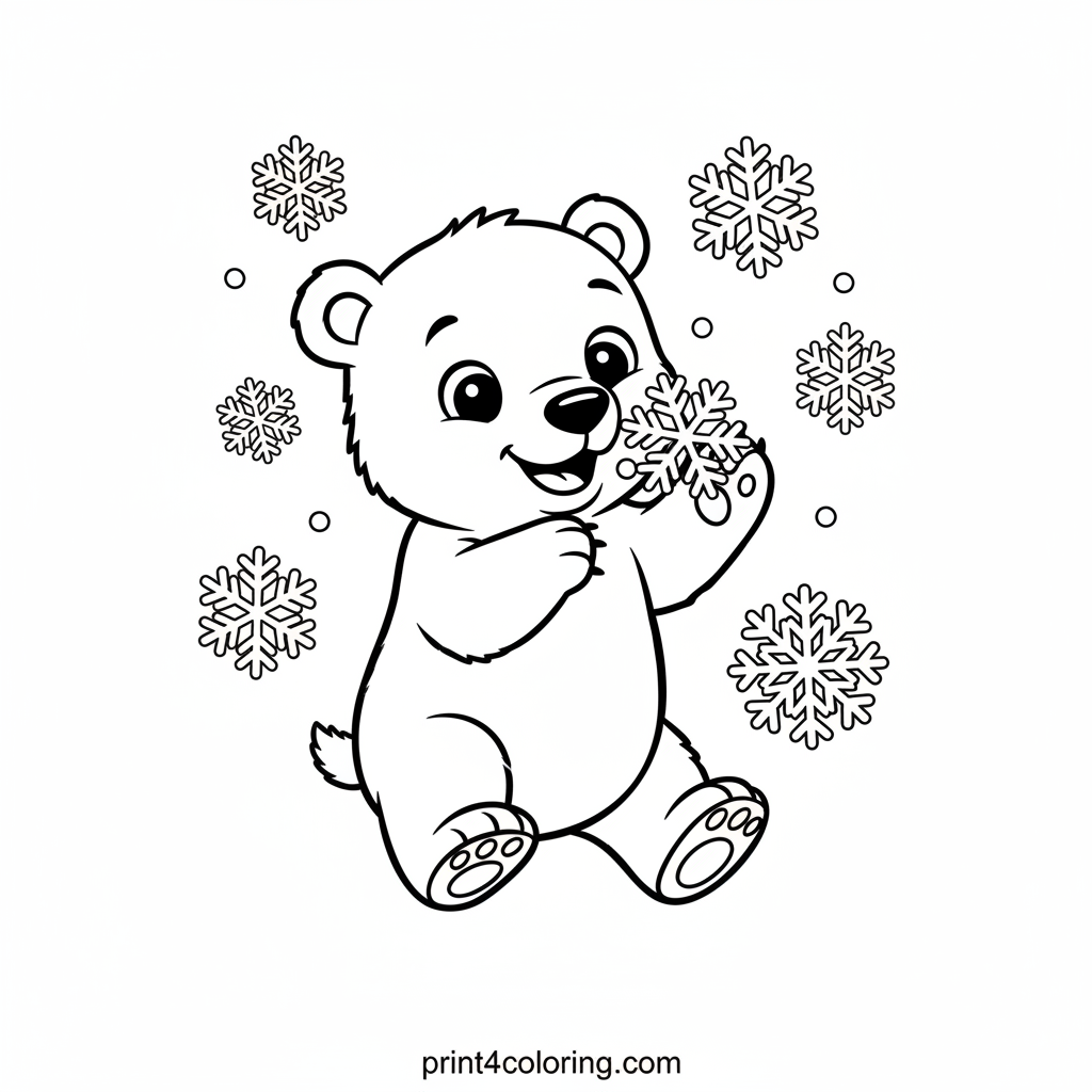 Meet a charming polar bear cub with sparkling, big round eyes and a joyful smile! This adorable little bear is having a magical moment, gently trying to catch a fluffy snowflake right on its tiny nose. More delicate snowflakes drift down around it, creating a serene winter scene perfect for a cozy coloring session. Get ready to add vibrant colors to this heartwarming picture!