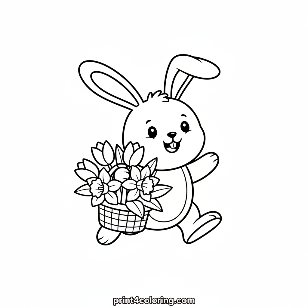 Hop into spring with this adorable coloring page! A cheerful bunny rabbit, with big floppy ears, is caught mid-hop, carrying a basket overflowing with freshly picked spring flowers like vibrant tulips and sunny daffodils. It's a delightful scene for young artists to bring to life!