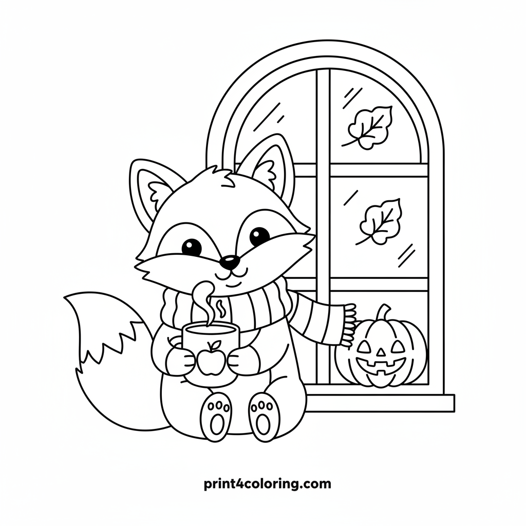 Join a cheerful fox in a cozy scarf, sipping warm apple cider by a window. Outside, colorful autumn leaves and a friendly pumpkin create a perfect fall scene. Use your favorite colors to bring this heartwarming autumn treat to life!