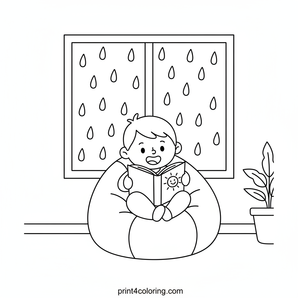 Snuggle up and color this charming scene! A happy child is enjoying a good book, curled comfortably on a soft beanbag chair. Gentle raindrops streak down the windowpane outside, making it the perfect cozy day to get lost in a story. Bring this indoor reading adventure to life with your favorite colors!