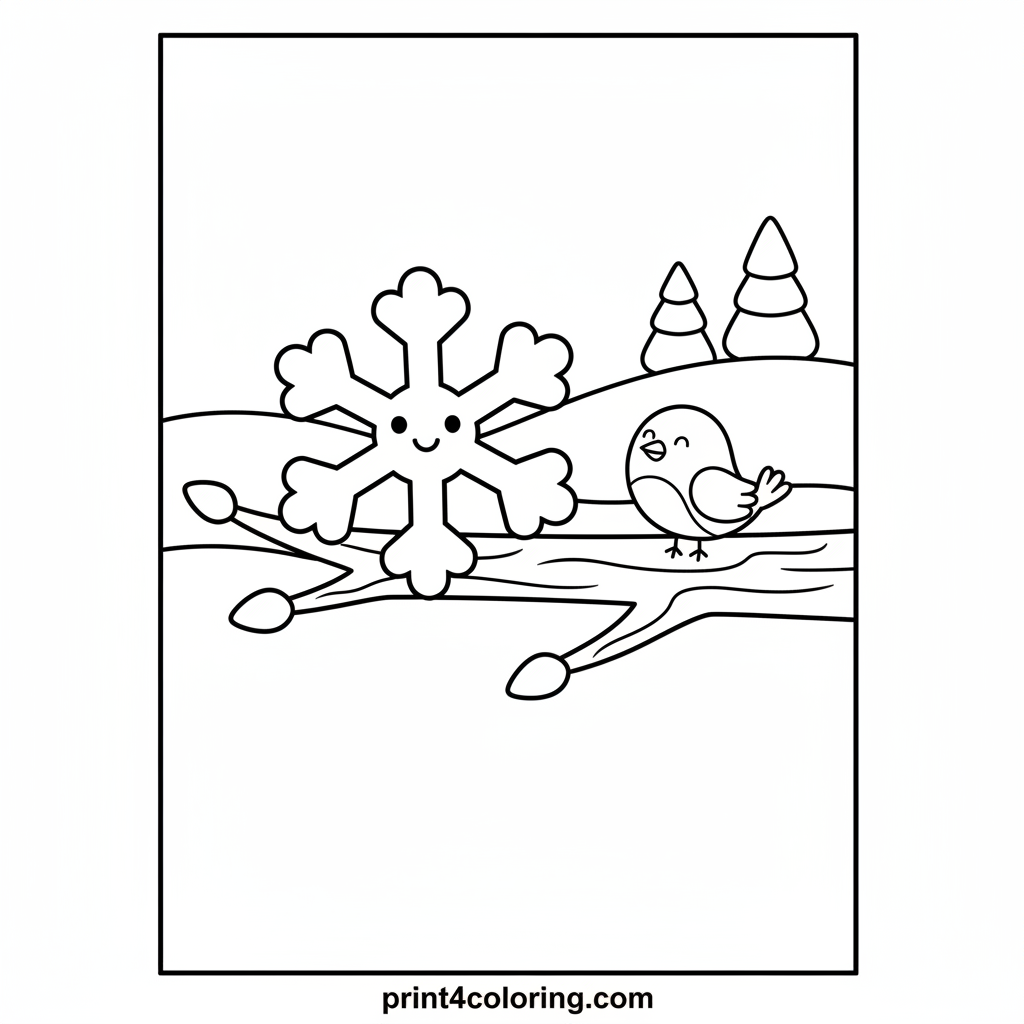 Imagine a giant, friendly snowflake nestled on a snowy tree branch, keeping a watchful eye on a cheerful little bird. This peaceful winter scene invites you to add your favorite colors to the gentle snow, the cozy branch, and the happy bird. A perfect page for a quiet winter afternoon!