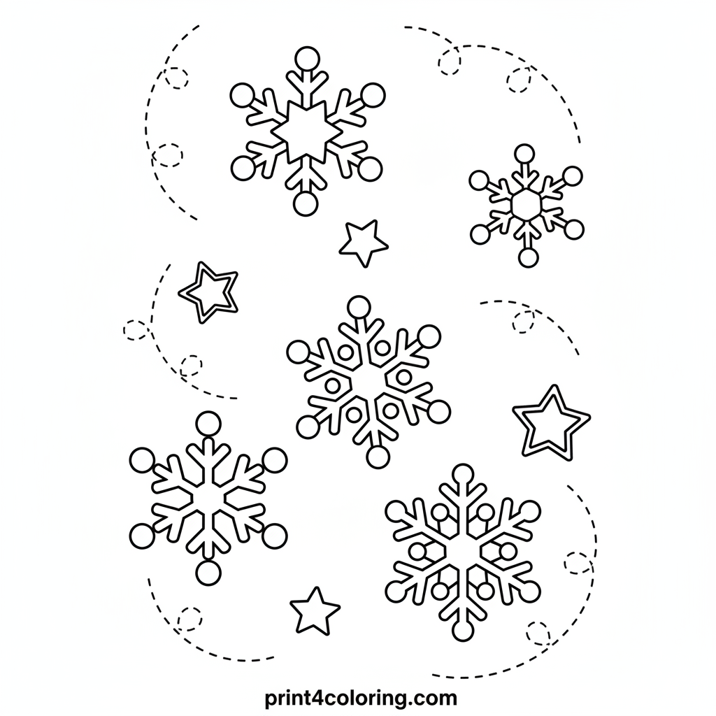 Watch a flurry of unique snowflakes as they gracefully twirl and swirl through the air, their playful dance marked by dotted lines. This easy coloring page invites you to bring winter's magic to life with your favorite colors, making each delicate snowflake sparkle and shine.