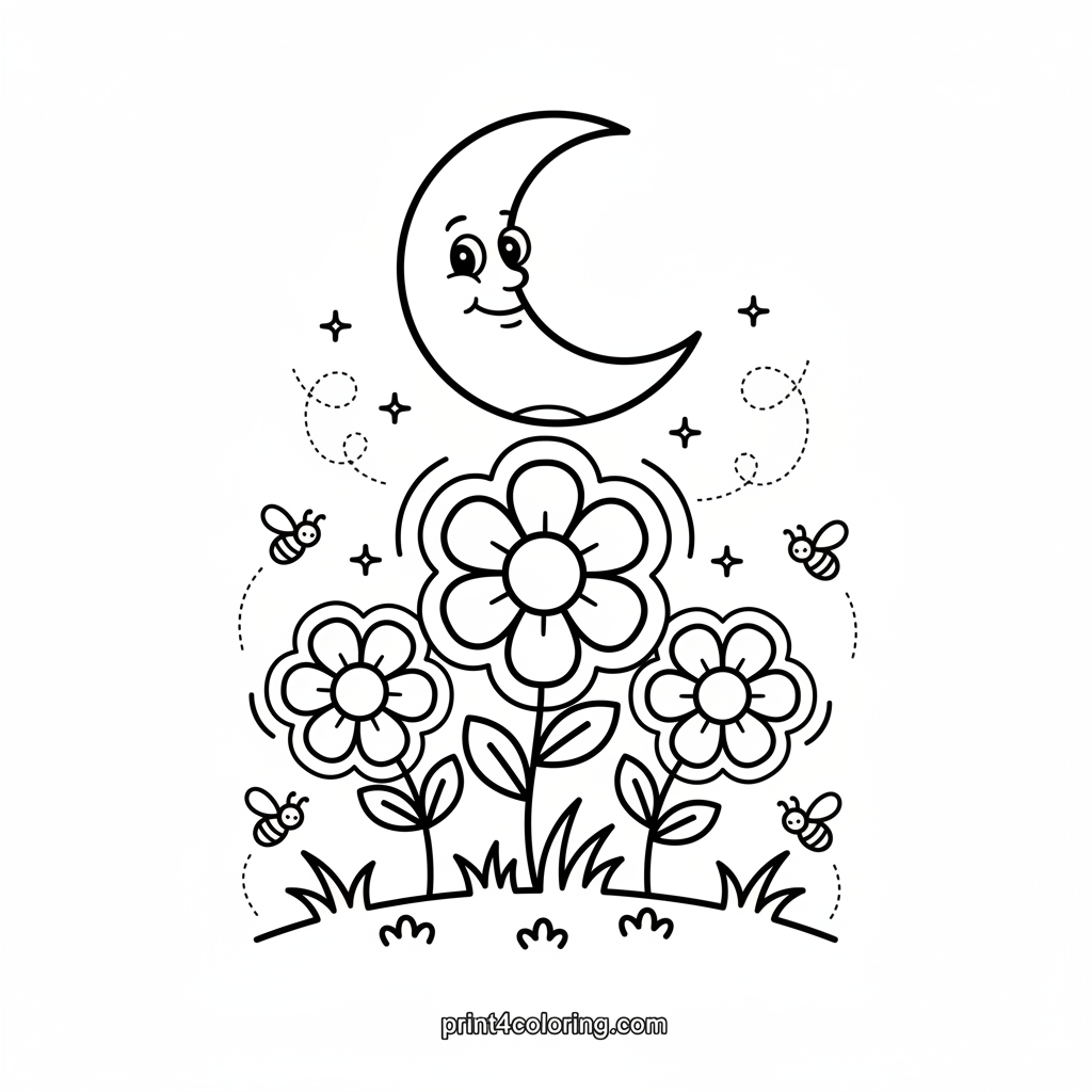 Step into a magical meadow where the night comes alive with soft light! Color glowing flowers, friendly fireflies twinkling like tiny stars, and a smiling crescent moon watching over all the gentle beauty. This whimsical scene invites you to add your favorite nighttime colors to create a truly enchanting masterpiece.