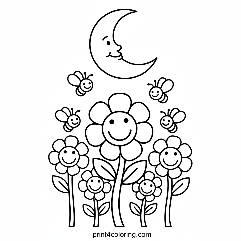 Step into a magical meadow where gentle moonbeams illuminate the night! Discover whimsical flowers that glow softly, creating a dreamy landscape. Watch tiny, twinkling fireflies dance and sparkle around the enchanting blooms under the friendly crescent moon. This serene scene is perfect for a peaceful coloring adventure.