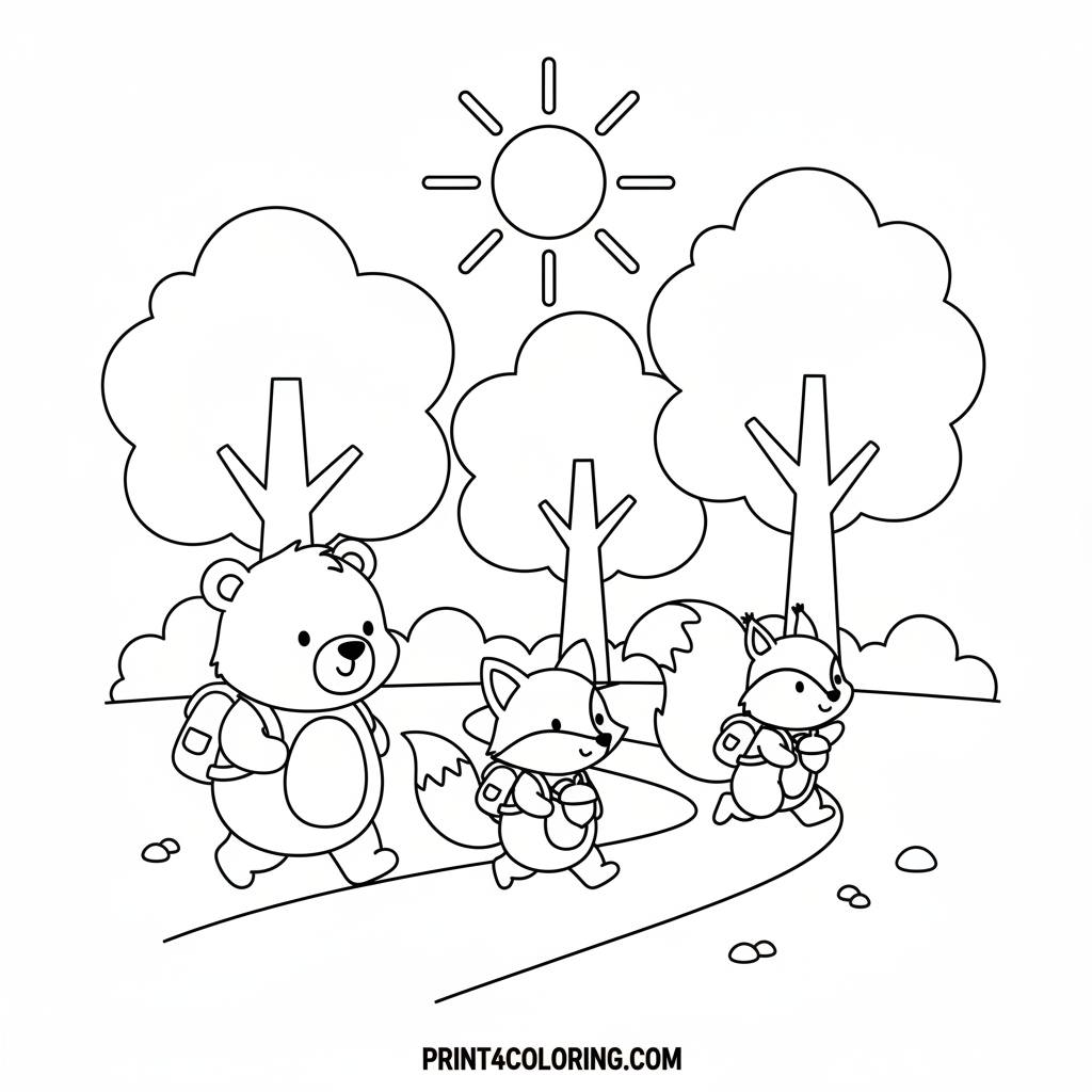Join a cute bear cub, a tiny fox, and a cheerful squirrel on an exciting hike! They're exploring a sunny forest, carrying their little backpacks, and smiling all the way. This delightful scene is perfect for young artists to bring to life with their favorite colors. Imagine all the fun they're having on their outdoor journey!