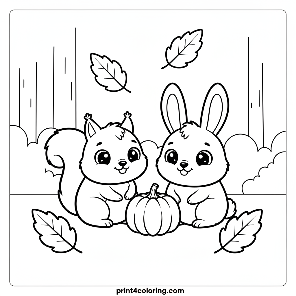 Meet a happy squirrel and a sweet little bunny sharing a small, round pumpkin in a cozy autumn forest clearing. Golden leaves flutter all around them, creating a magical fall scene. This heartwarming picture is perfect for coloring and celebrating friendship and the beauty of the season!