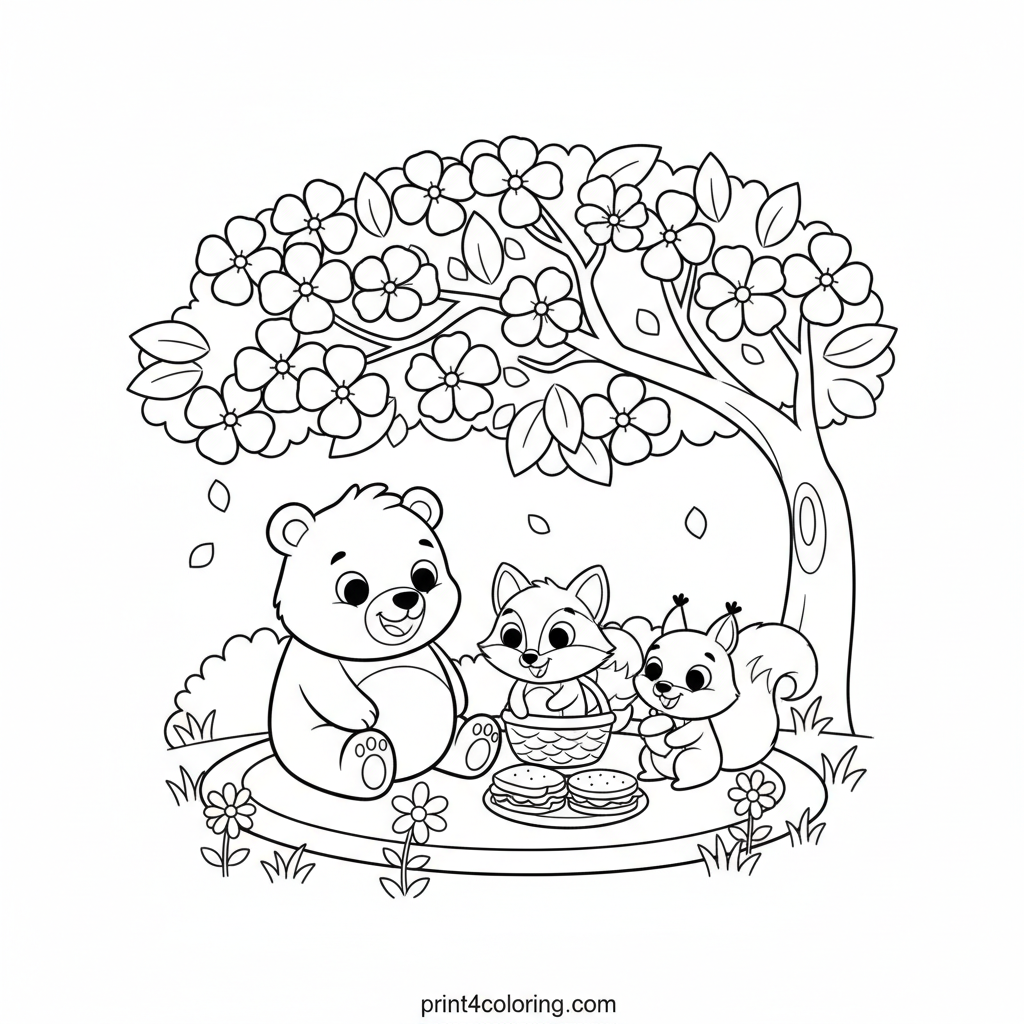 Join a happy bear cub, a giggling fox kit, and a smiling squirrel for a delightful spring picnic! They're sharing yummy treats on a cozy blanket beneath a beautiful cherry blossom tree, its petals gently falling. Imagine all the colors of spring as you bring this heartwarming scene to life with your crayons and markers!