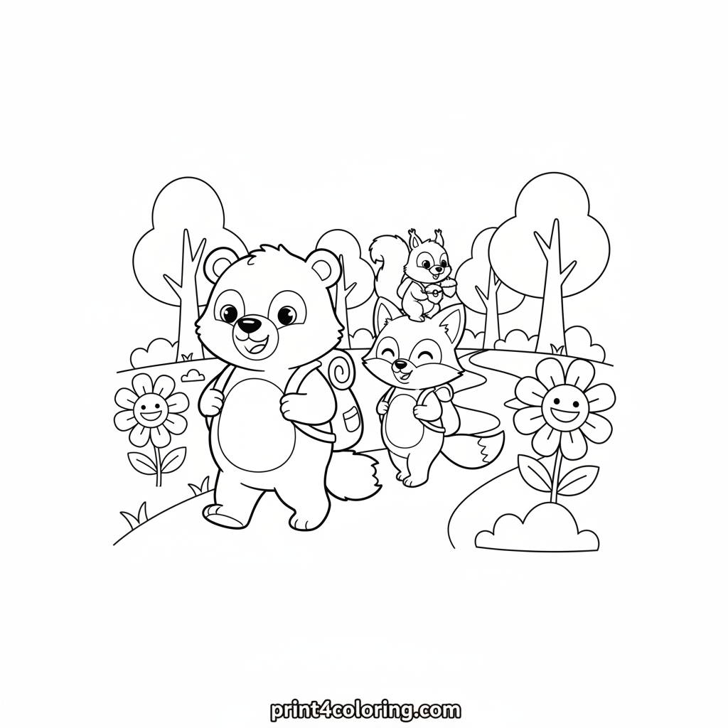 Imagine a sun-dappled forest where a friendly bear cub, a tiny fox, and a cheerful squirrel are on a grand adventure! With their little backpacks, they trek along a winding path, ready to discover all the wonders of nature. Bring this happy hike to life with your favorite colors and make their journey even brighter!