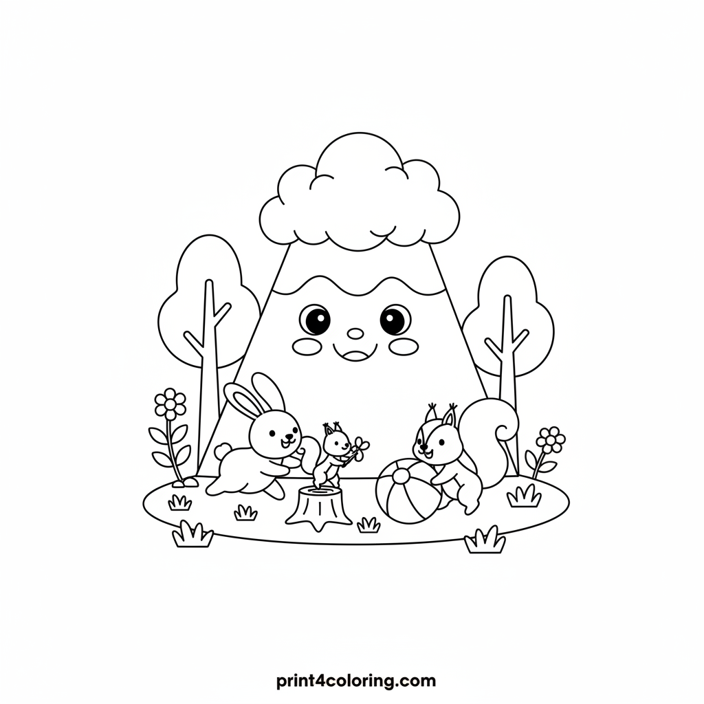 Discover a heartwarming scene where a friendly, smiling mountain wears a fluffy cloud hat! At its base, happy forest animals like playful bunnies and curious squirrels frolic and play. This delightful coloring page invites you to bring vibrant life to a peaceful mountain landscape filled with adorable, joyful creatures. Perfect for a relaxing and fun coloring adventure!