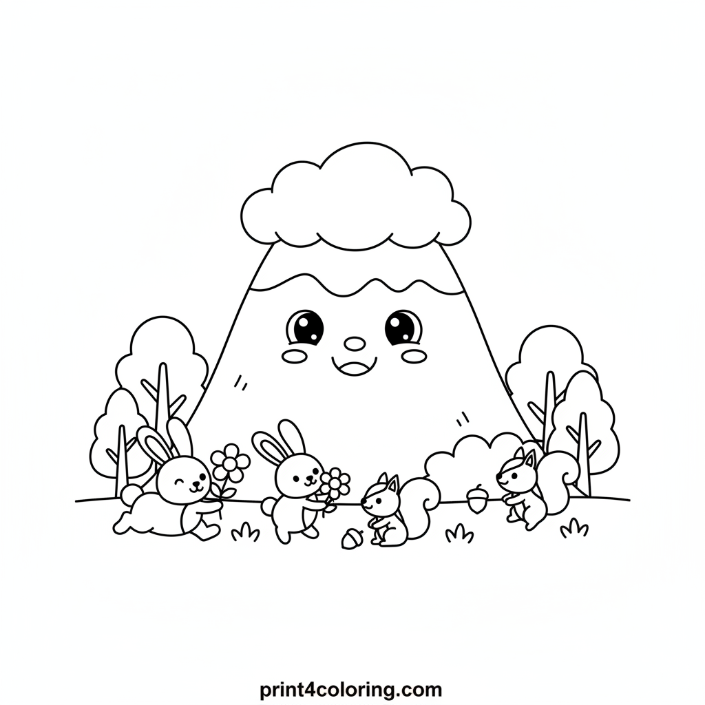 Join a gentle, smiling mountain wearing a fluffy cloud hat! At its base, happy forest friends like hopping bunnies and busy squirrels are playing. This cheerful scene is perfect for little artists to bring to life with their favorite colors, creating a world of outdoor fun and friendship.