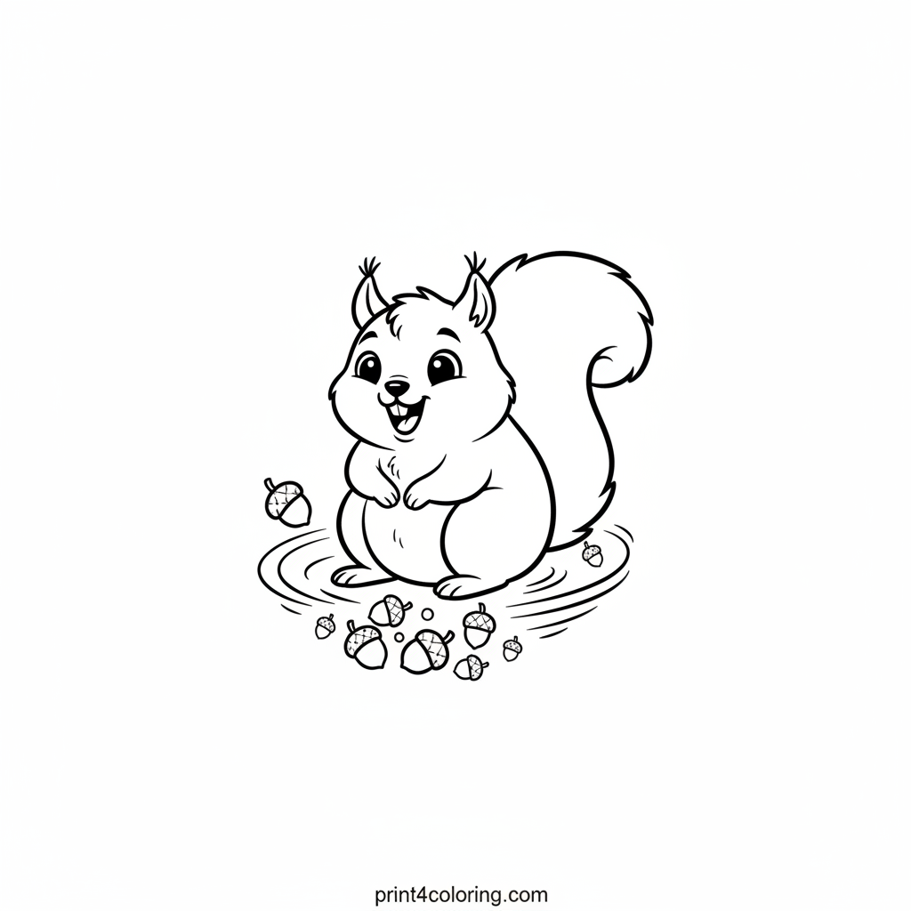 Join a plump, happy squirrel as it giggles with delight! A tiny, playful gust of wind is swirling a pile of acorns and nuts around its feet, making them dance in a joyful circle. This adorable scene is perfect for little artists to bring to life with their favorite colors.