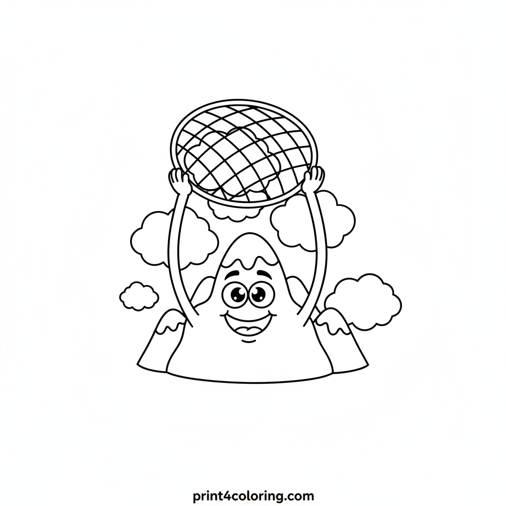 Meet our goofy, friendly mountain character with super long, stretchy arms! He loves playing a fun game, trying to catch fluffy white clouds in his giant, colorful net. Imagine adding bright colors to his rocky smile, the soft clouds, and his amazing cloud-catching tool in this whimsical, sky-high adventure!