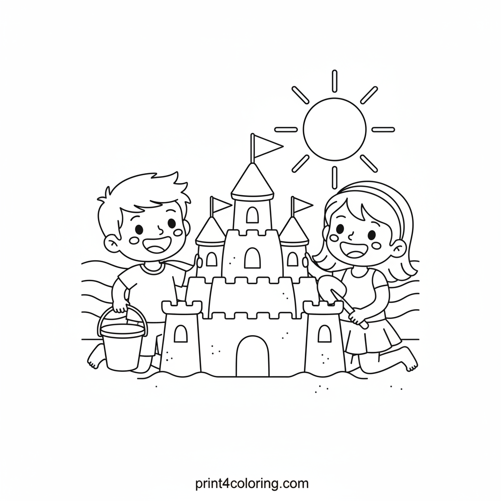 Join two cheerful friends on a sunny beach as they teamwork to create the most incredible sandcastle ever! One child carries a bucket, while the other expertly wields a shovel, shaping tall towers and grand walls. Gentle waves lap in the background, making it a perfect day for building and dreaming by the sea.