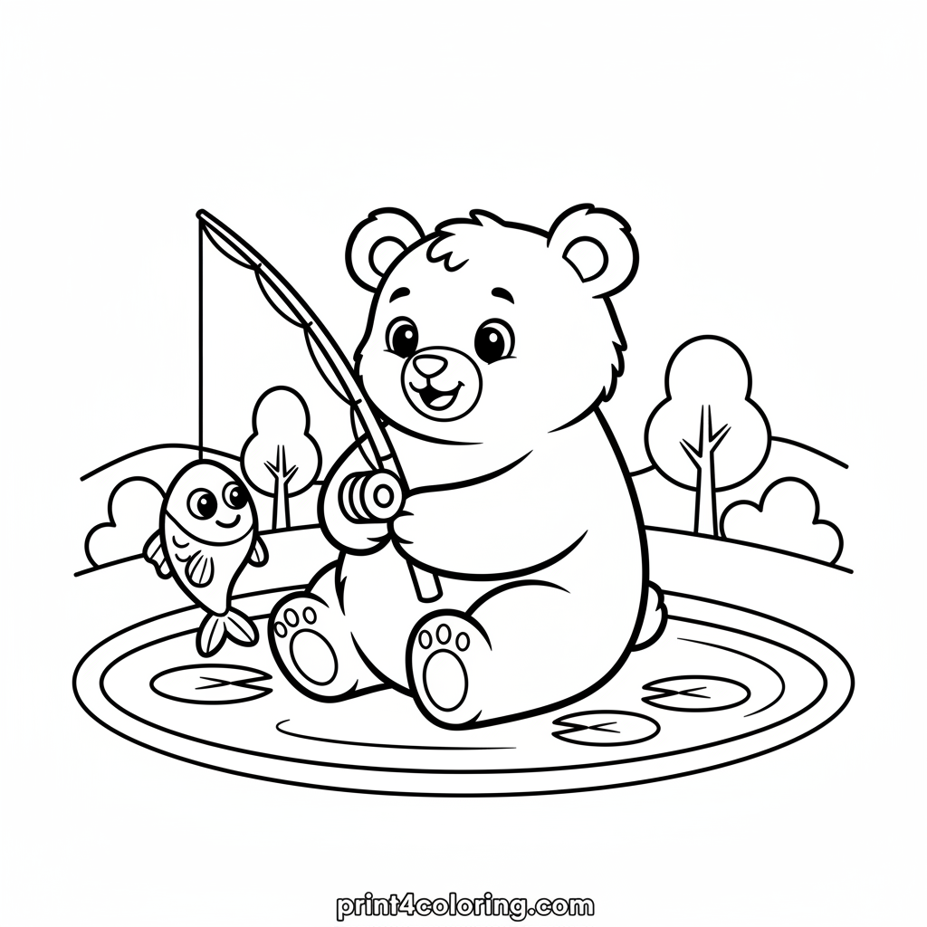 Join a fluffy, smiling bear cub with big, curious eyes, sitting happily by a calm pond. This adorable cub just made its very first catch! A friendly, wiggling fish with a big smile is on the end of its simple fishing rod. A heartwarming scene ready for your colorful imagination!