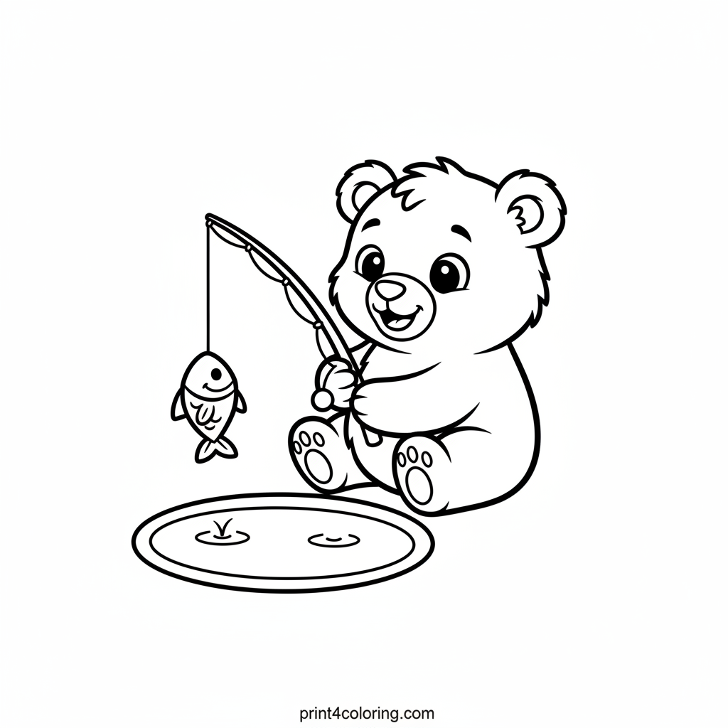 Dive into a heartwarming scene with a fluffy, smiling bear cub! With big, curious eyes, this adorable little bear sits happily by a peaceful pond. It's proudly holding a simple fishing rod, and guess what? A friendly, wiggling fish with a big smile is on the end of the line, ready for your colors!
