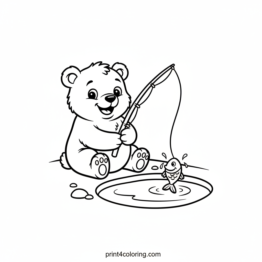 Meet a fluffy, smiling bear cub on its very first fishing adventure! With big, curious eyes, our happy cub sits by a calm pond, holding a simple fishing rod. A friendly, wiggling fish with a big smile is on the end of the line! This heartwarming scene is perfect for young artists to bring to life.