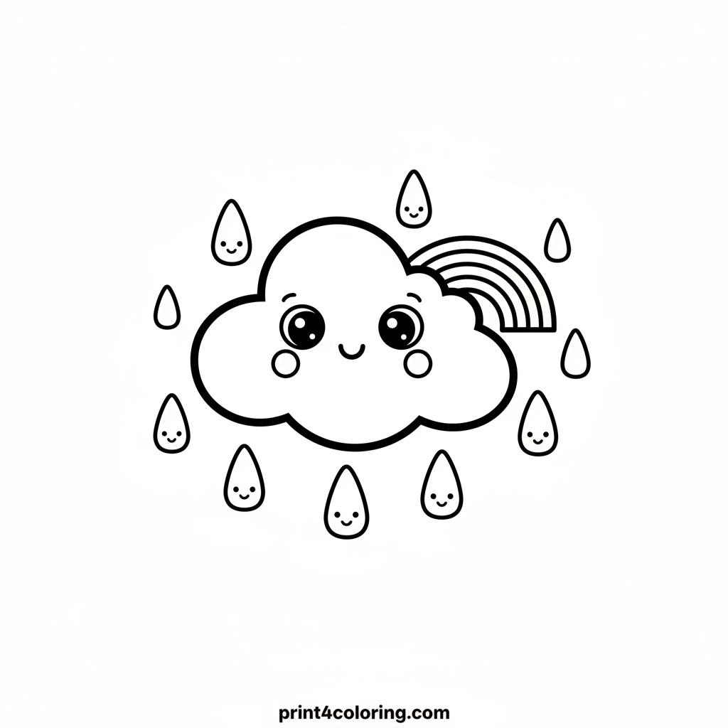 Meet a very happy, plump cloud with big, friendly eyes and rosy cheeks, ready to brighten your day! A small, cheerful rainbow emerges from its side, surrounded by gentle raindrops, each with a tiny smile. This delightful scene is perfect for little artists to bring to life with their favorite colors.
